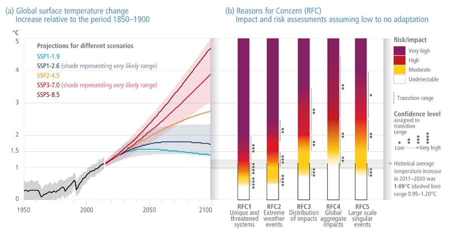 Figure 1. Summary of reasons for concern. Taken from IPCC WG2 AR6 figure SPM-3. (a) Global surface temperature changes in °C relative to 1850–1900; (b) The Reasons for Concern framework communicates scientific understanding about accrual of risk for five broad categories.