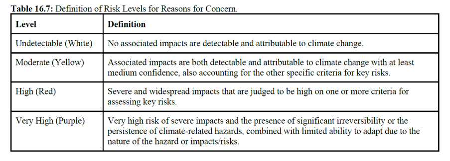 The process forms an expert consensus across each RFC on the global warming level at which the risk transitions from low (“undetectable”) to “moderate”, “high” and then “very high” levels – as described in the report’s table 16.7.